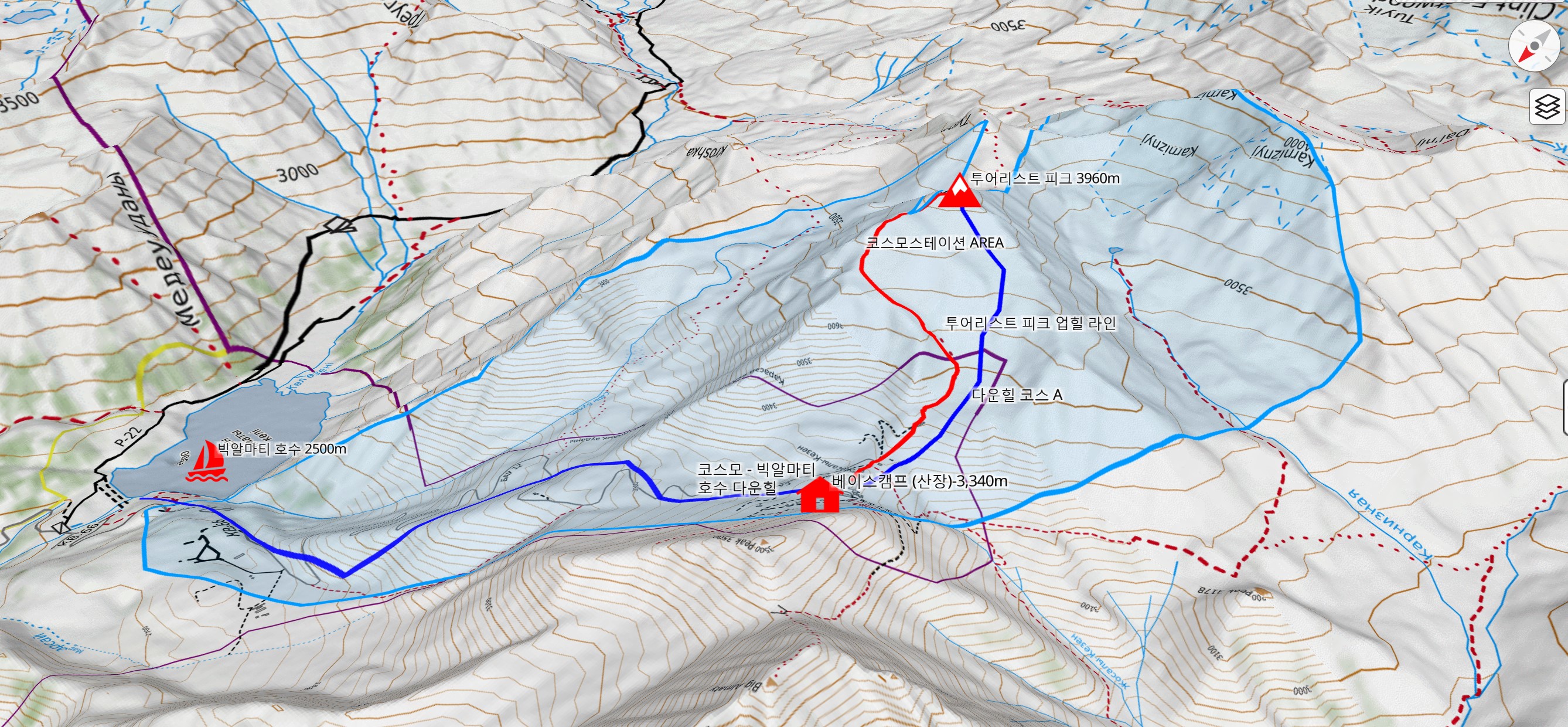 눈 덮인 호수 주변의 백컨트리 라인, 아름다움과 스릴의 조화로 2,500m의 안정적 적설 + 빙하 협곡과 천문대 인근 코스까지