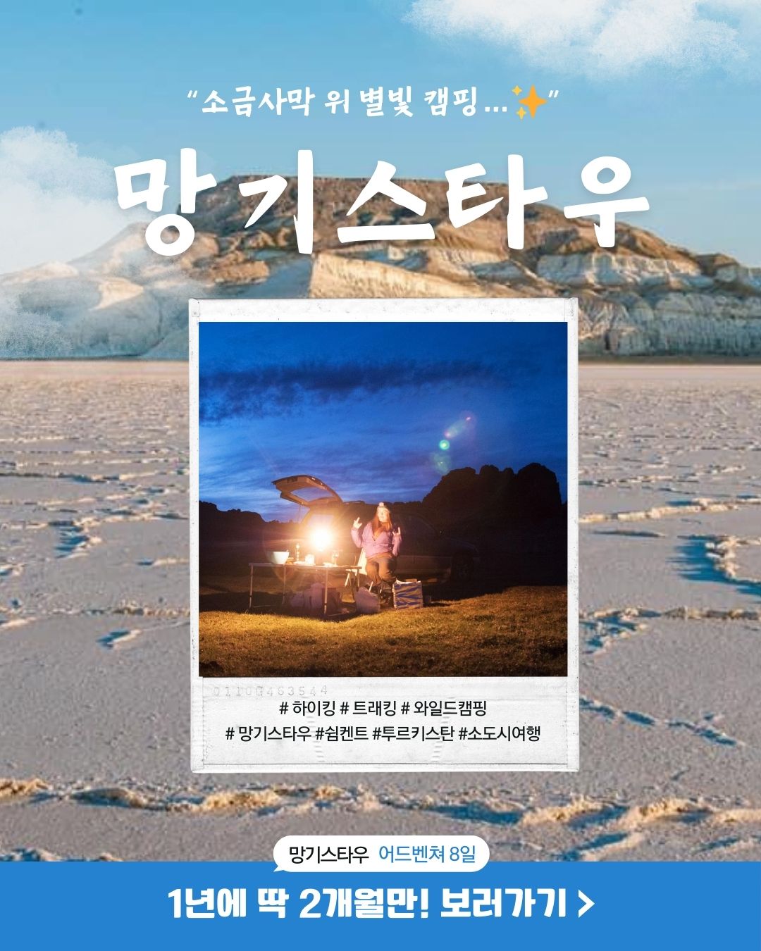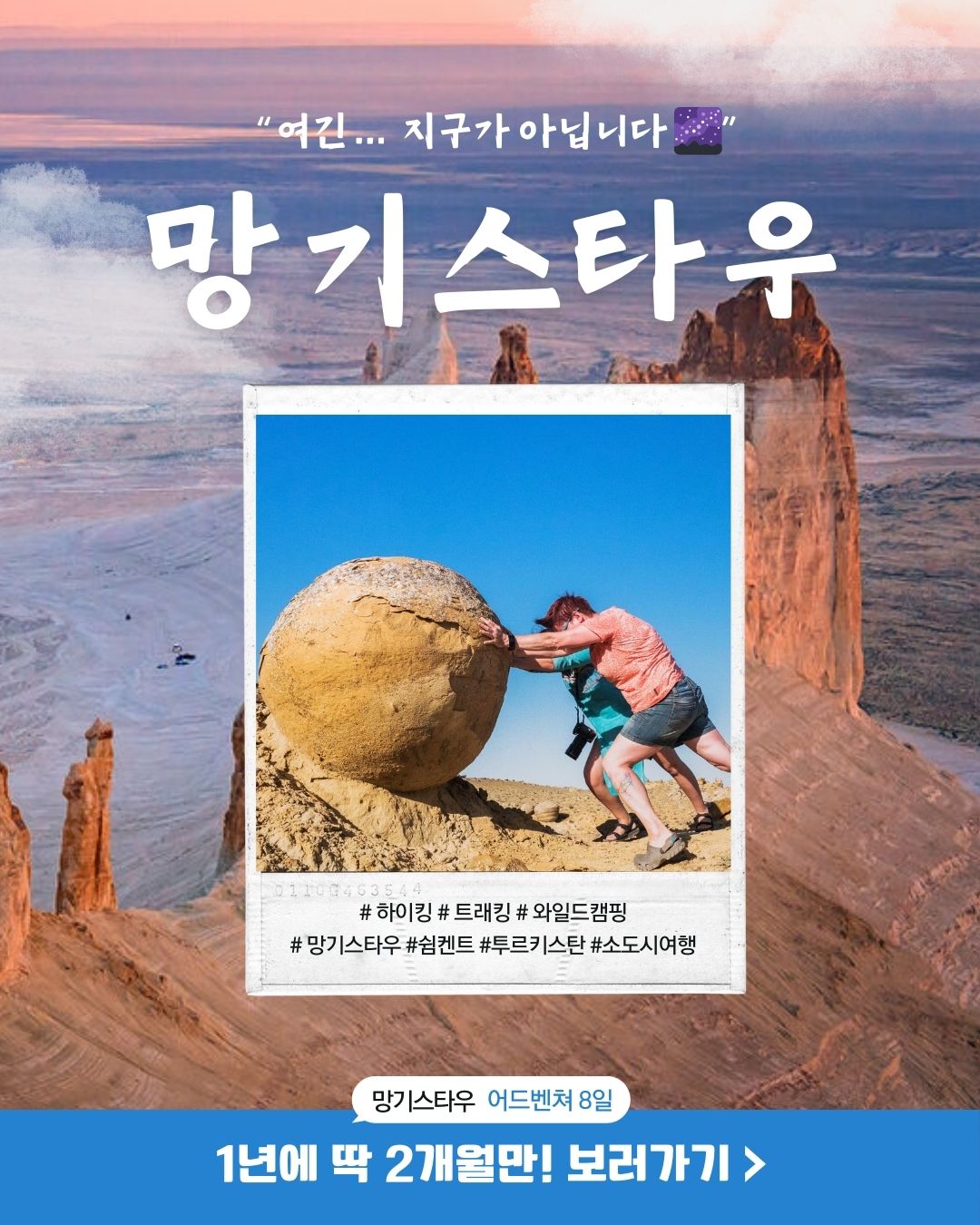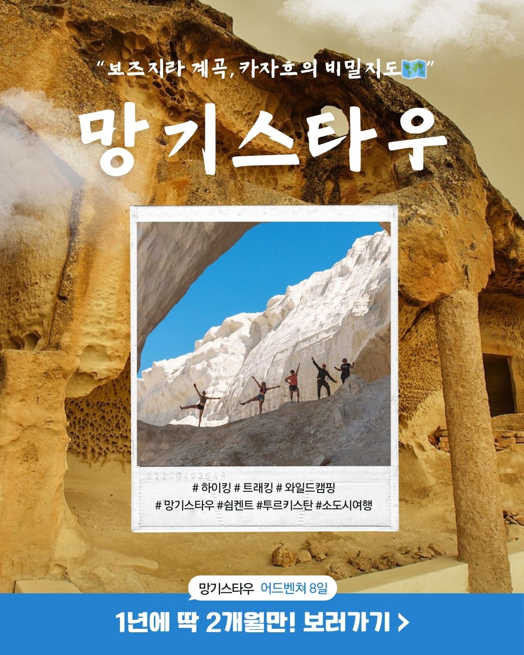 카자흐스탄 서부의 광활한 대지, 망기스타우는 아직 많은 이들에게 미지의 땅으로 남아있습니다. 그러나 이곳에는 자연이 수천 년에 걸쳐 빚어낸 경이로운 풍경들이 숨겨져 있습니다. 이번 여행은 그 숨겨진 보석들을 찾아 떠나는 특별한 여정입니다.