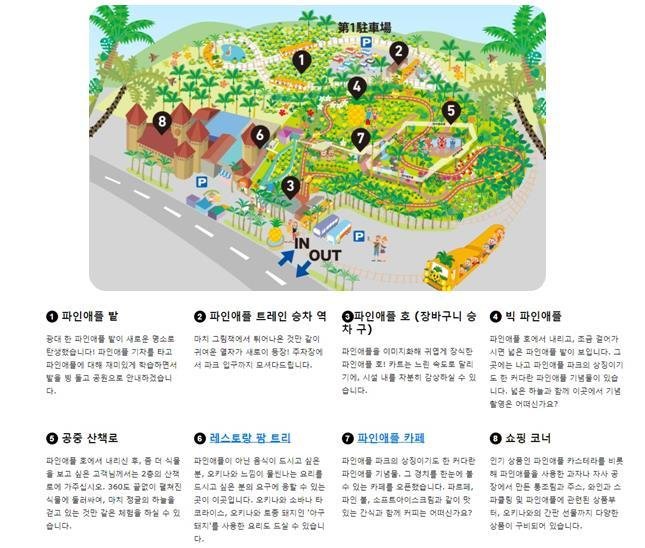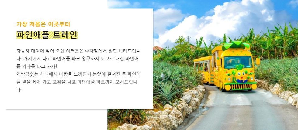 일년 내내 따뜻한 날씨의 오키나와는 파인애플이 자라기에 최적의 조건을 갖추고 있습니다. 오키나와 나고의 파인애플 파크는 오키나와 관광시 빼놓을 수 없는 관광지이죠. 나고시에 위치한 파인애플 파크는 파인애플과 관련한 다양한 체험이 가능한 이색 테마 파크에요. 공원 내에서는 음성 가이드 서비스가 제공되는 귀여운 파인애플 카트를 타고 여러 종류의 파인애플과 아열대 식물들을 만나볼 수 있으며, 파인애플로 만든 맛있는 식음료 및 디저트도 맛볼 수 있습니다. 남녀노소, 가족단위 누구에게나 사랑받고 있는 나고 파인애플 파크를 오키나와에서 꼭 만나보세요!