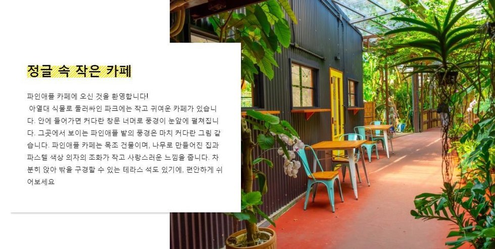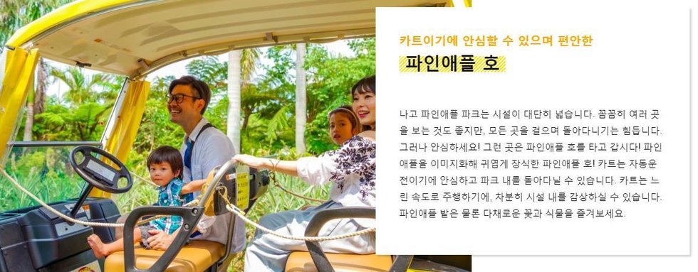 파인애플 꽃길과, 야자수 터널 등의 열대 정원에서 파인애플 부터 이국적인 파인애플 꽃을 감상해보세요. 또 파인애플 파크는 전천후 공원이기 때문에, 비가 와도 걱정하실 필요가 없답니다. 파인애플 카트 이용 후에는 공원을 거닐며 여러 식물들이 내뿜는 음이온을 한껏 느껴보세요. 일상 속에서의 피로가 풀릴거예요.